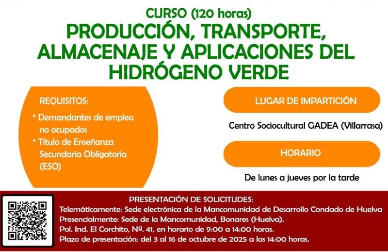 Se abre el plazo de inscripción para el curso «Producción, transporte, almacenaje y aplicaciones del hidrógeno verde», que impartirá la Mancomunidad de Desarrollo Condado de Huelva en Villarrasa, en horario de tarde, entre el 27 de octubre al 17 de diciembre.